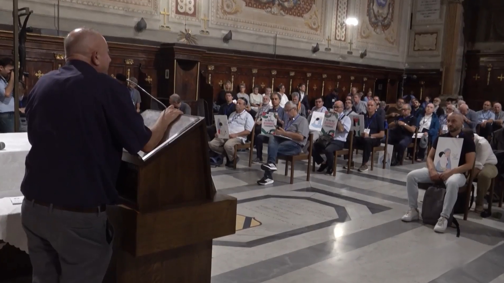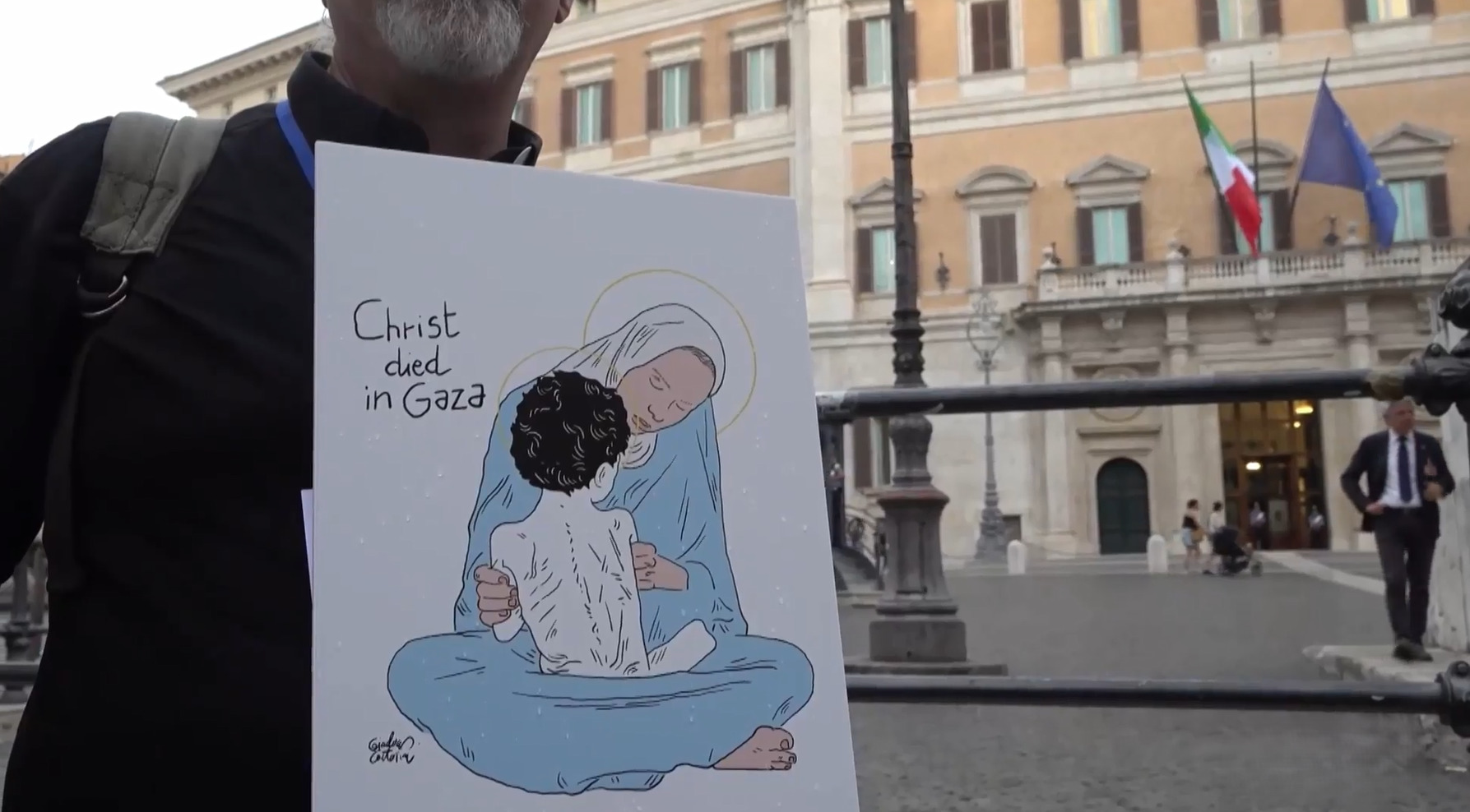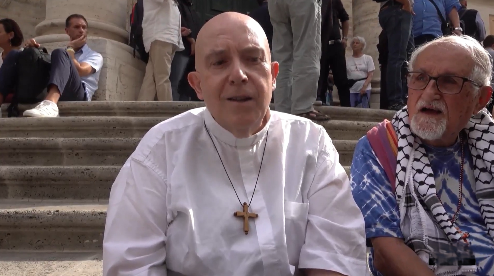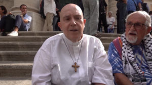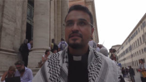 Katolik din adamları da eyleme katılarak Gazze’de yaşananlara dikkat çekti. Rahip Andrea Palamides, “Acı, öfke ama en çok da Tanrı’ya ‘Ne yapmam gerektiğini söyle?’ deme ihtiyacı hissediyorum” derken, Bir diğer din adamı Pietro Rossini ise Gazze’de yaşananları “soykırım” olarak nitelendirerek, “Böyle devam ederse Gazze diye bir yer kalmayacak ya da artık Filistin halkı Gazze’de olmayacak” ifadelerini kullandı.