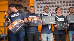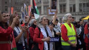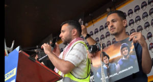 Göstericiler, üzerinde ölen Filistinli gazetecilerin fotoğraflarının bulunduğu tabut maketleri taşıdı. Bazı katılımcılar Filistin bayrakları dalgalandırırken, kimileri de kırmızıya boyanmış basın yeleklerini havaya kaldırdı.